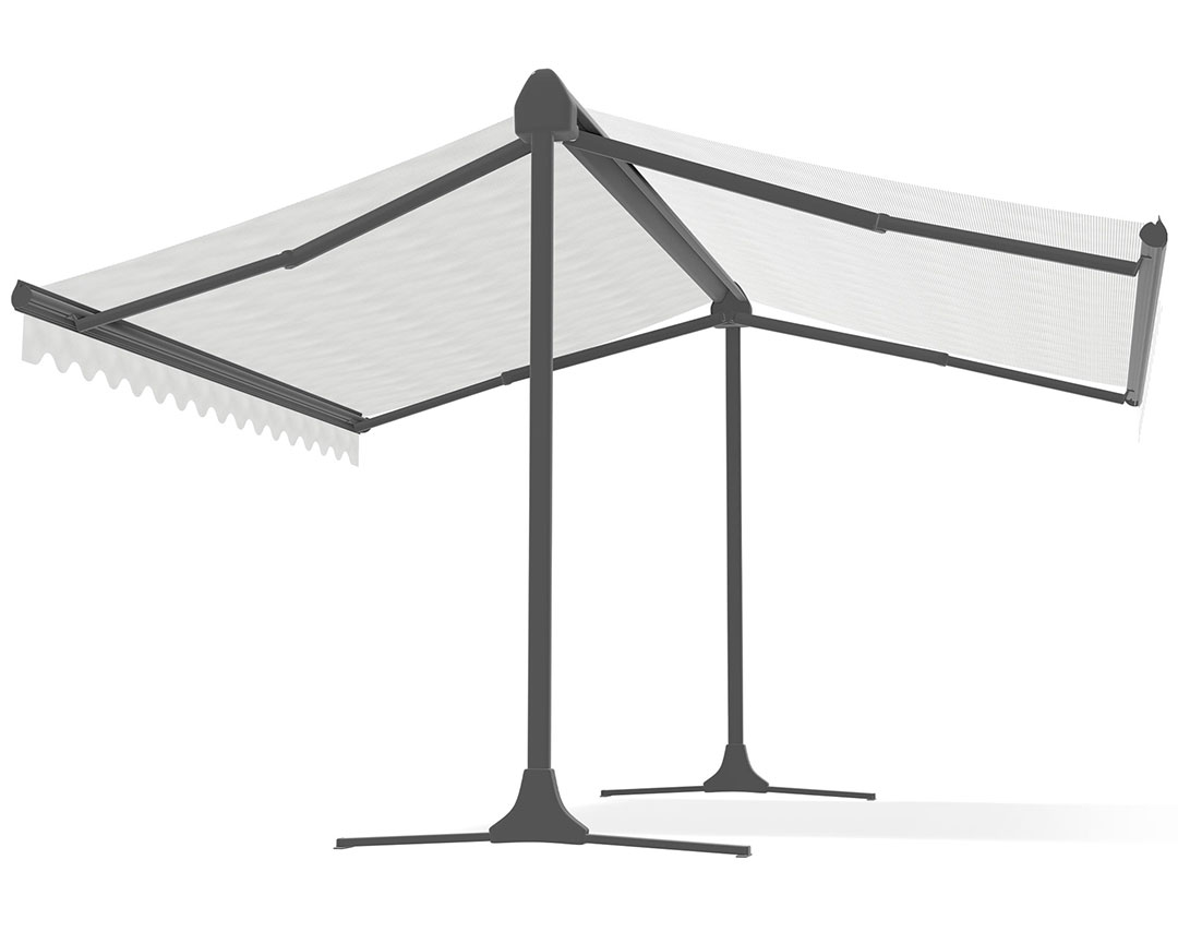 Eine freistehende Doppel-Markise wie die Alaris eignet sich ideal zur Beschattung großer Flächen, Freisitze, Restaurant-Terrassen, Spielbereiche und Sandkästen. Die stabilen Gelenkarme mit Doppelseilzügen fahren die Seiten synchron aus. Für einen sicheren Stand sorgen T‑Stützen oder einbetonierte Bodenhülsen. Auch hier haben Sie unzählige Konfigurationsmöglichkeiten, angefangen beim Gestell, über die Tuchart und das Dessin bis hin zu unterschiedlichen Bedienkonzepten.